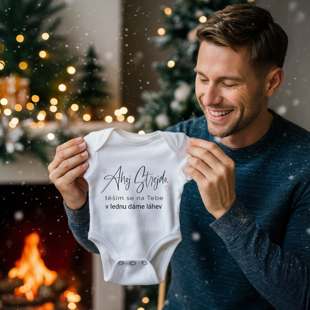Představujeme naše dětské body s nápisem "Ahoj Strejdo". Toto roztomilé a osobní body je skvělým způsobem, jak oznámit radostnou zprávu nastávajícímu strejdovi. Pod hlavním nápisem je text "Těším se na Tebe" a prostor, kam můžete přidat vlastní text, například: "Těším se na tebe v září" nebo "Těším se na tebe na Vánoce".