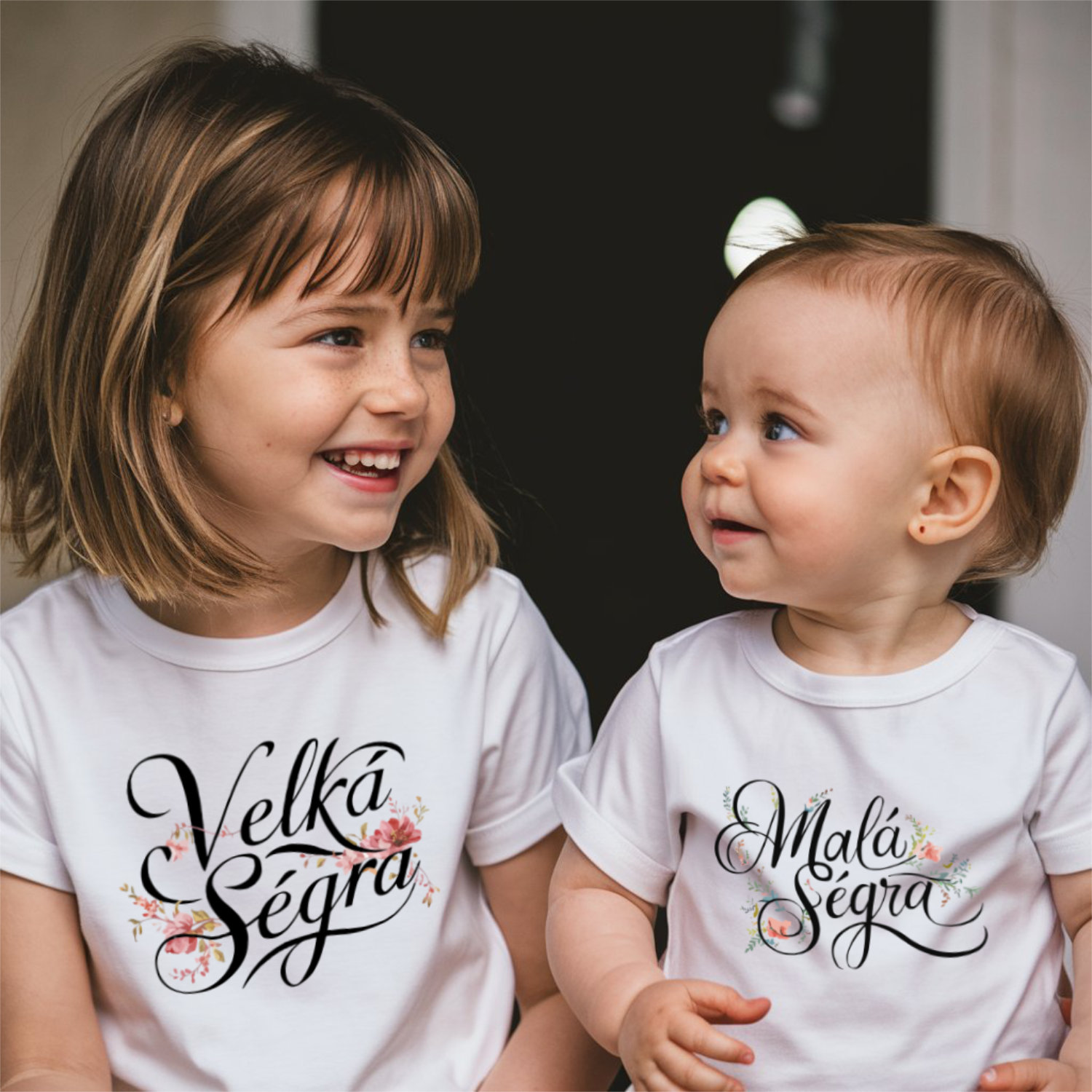 Představujeme nové sourozenecké tričko "Velká ségra"! Toto krásné tričko je navrženo v elegantním kaligrafickém stylu a doplněno ozdobnými kytičkami, které dodávají dívčí šarm. Ideální pro starší sestru, která je hrdá na svou roli a ráda se pochlubí svým malým sourozencem. Perfektní pro rodinné focení, speciální příležitosti nebo jako milý dárek. Tričko je vyrobeno z měkkého a pohodlného materiálu, který zaručuje pohodlí po celý den.