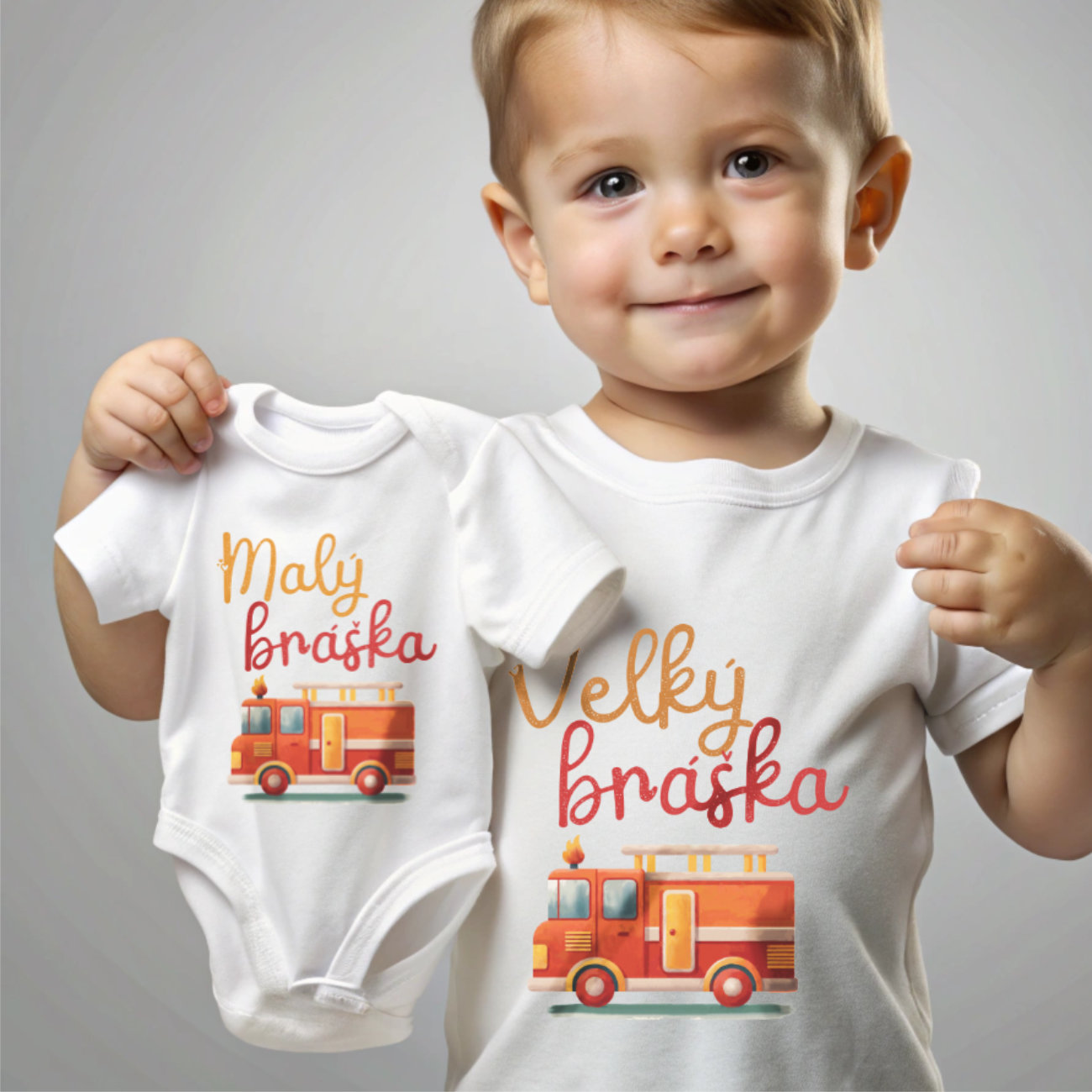 Potisk „Malý bráška“ s roztomilým hasičským autem je ideální volbou pro nejmladšího člena rodiny. Hravý design je ideální pro focení sourozenců, zvláště když je spárován s tričkem „Velký bráška“ z naší nabídky. Tato sourozenecká sada je také skvělý dárek nebo způsob, jak stylově oznámit příchod nového miminka do rodiny.