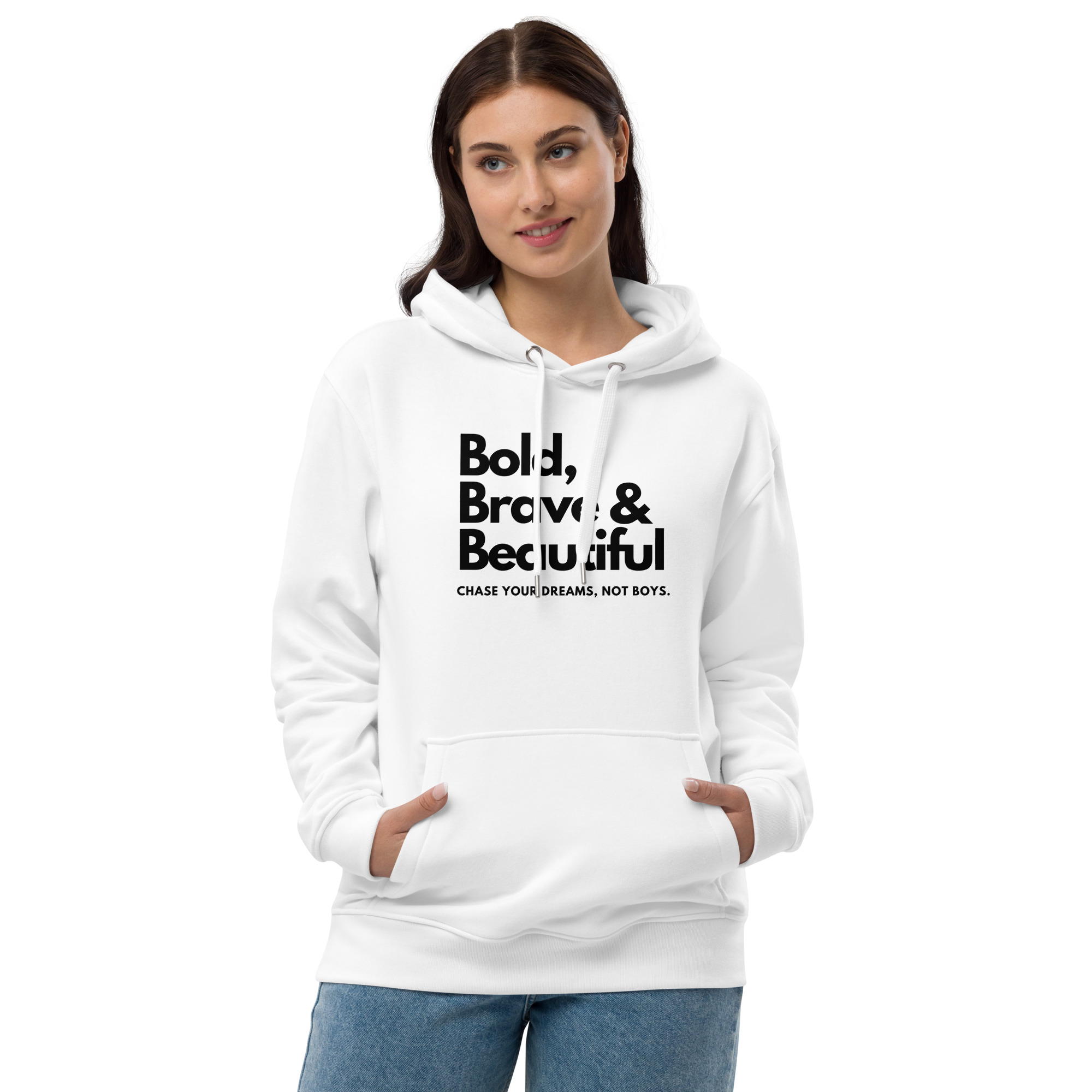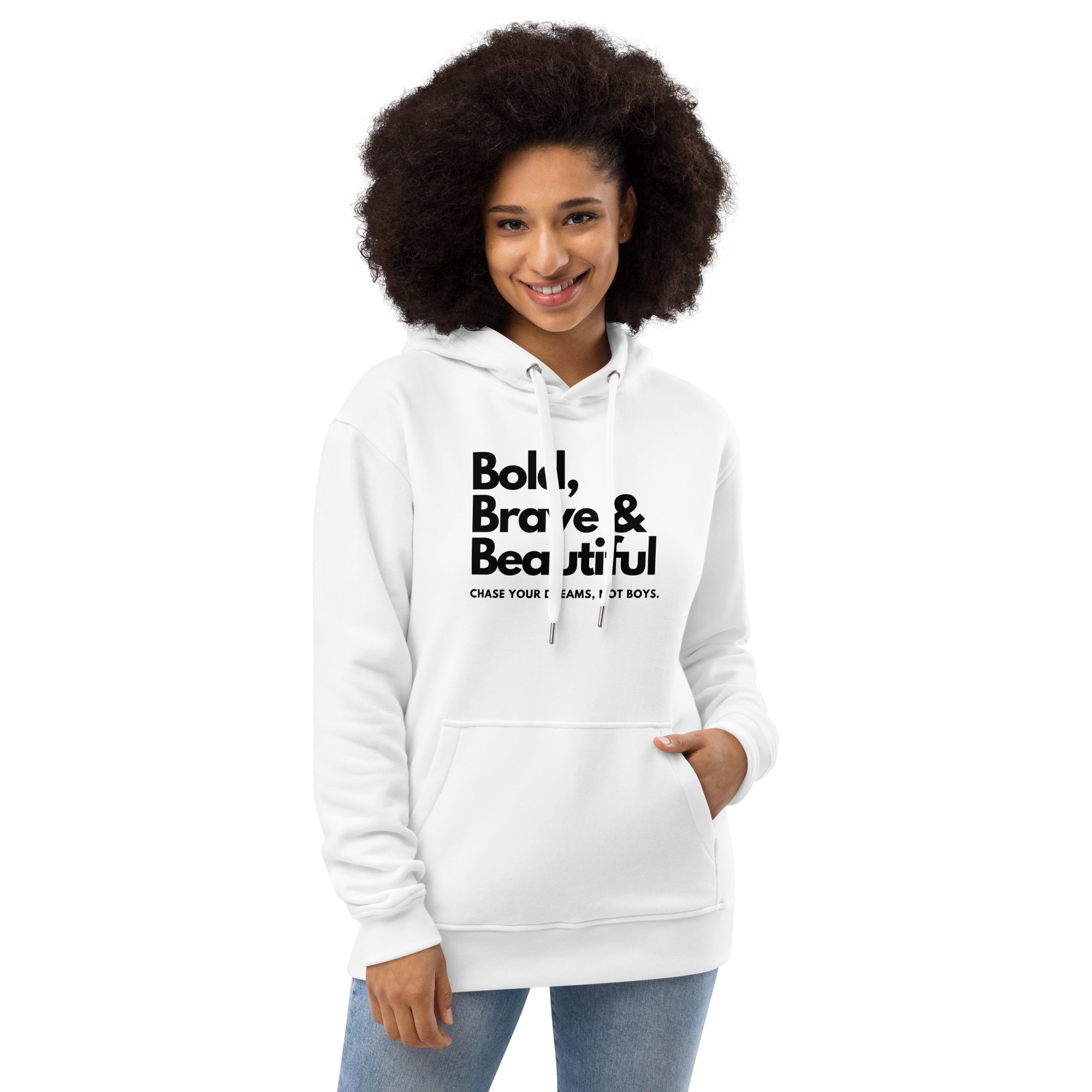 Zahalte se do naší exkluzivní mikiny s nápisem 'Bold, Brave & Beautiful' a nechte svou odvážnou krásu zářit. Tato měkoučká a stylová mikina nejenže zdůrazní vaši silnou osobnost, ale také vám poskytne pohodlí na každém kroku. Překročte hranice módy a buďte neohroženě elegantní. Naše mikina je více než jen o oblečení, je to prohlášení o sebevědomí a odvaze. Buďte odvážná, buďte krásná, buďte nezaměnitelná.