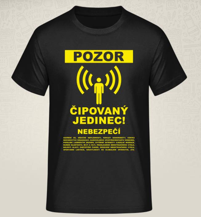 Rozlišovací triko pro očkované Šorošovy ovce, aby se jim mohli slušní lidi se školou života a selským rozumem vyhnout.