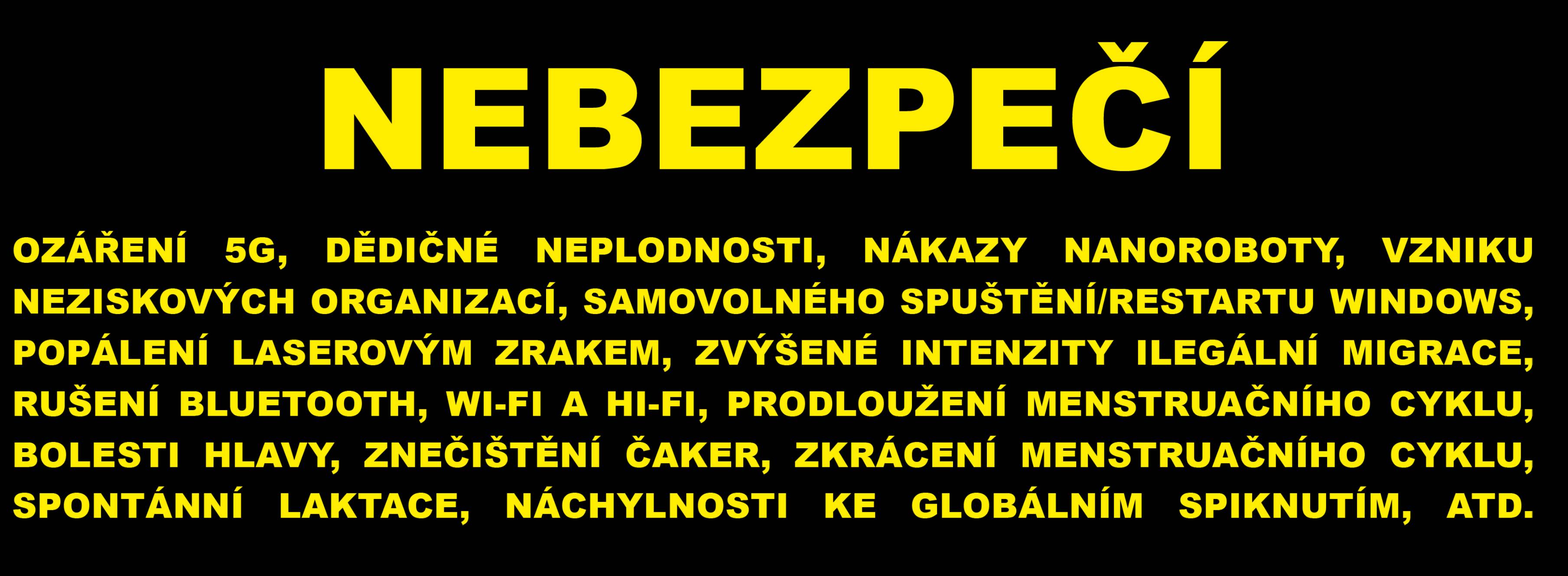text dole: OZÁŘENÍ 5G, DĚDIČNÉ NEPLODNOSTI, NÁKAZY NANOROBOTY, VZNIKU NEZISKOVÝCH ORGANIZACÍ, SAMOVOLNÉHO SPUŠTĚNÍ/RESTARTU WINDOWS, POPÁLENÍ LASEROVÝM ZRAKEM, RUŠENÍ BLUETOOTH A WI-FI, PRODLOUŽENÍ MENSTRUAČNÍHO CYKLU, BOLESTI HLAVY, ZNEČIŠTĚNÍ ČAKER, ZKRÁCENÍ MENSTRUAČNÍHO CYKLU, SPONTÁNNÍ LAKTACE, NÁCHYLNOSTI KE GLOBÁLNÍM SPIKNUTÍM, ATD.