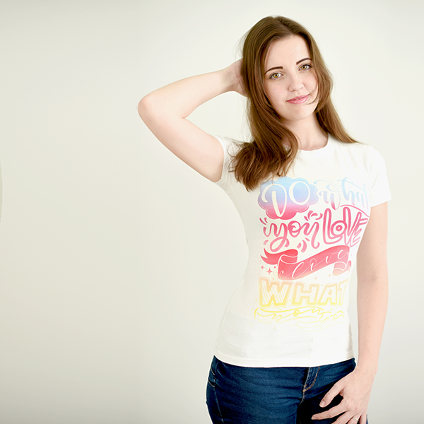 Tričko s barevným, pastelově duhovým písmem.Digitálně psané motto Dělej co miluješ, miluj co děláš v angličtině Do What You Love, Love What You Do.