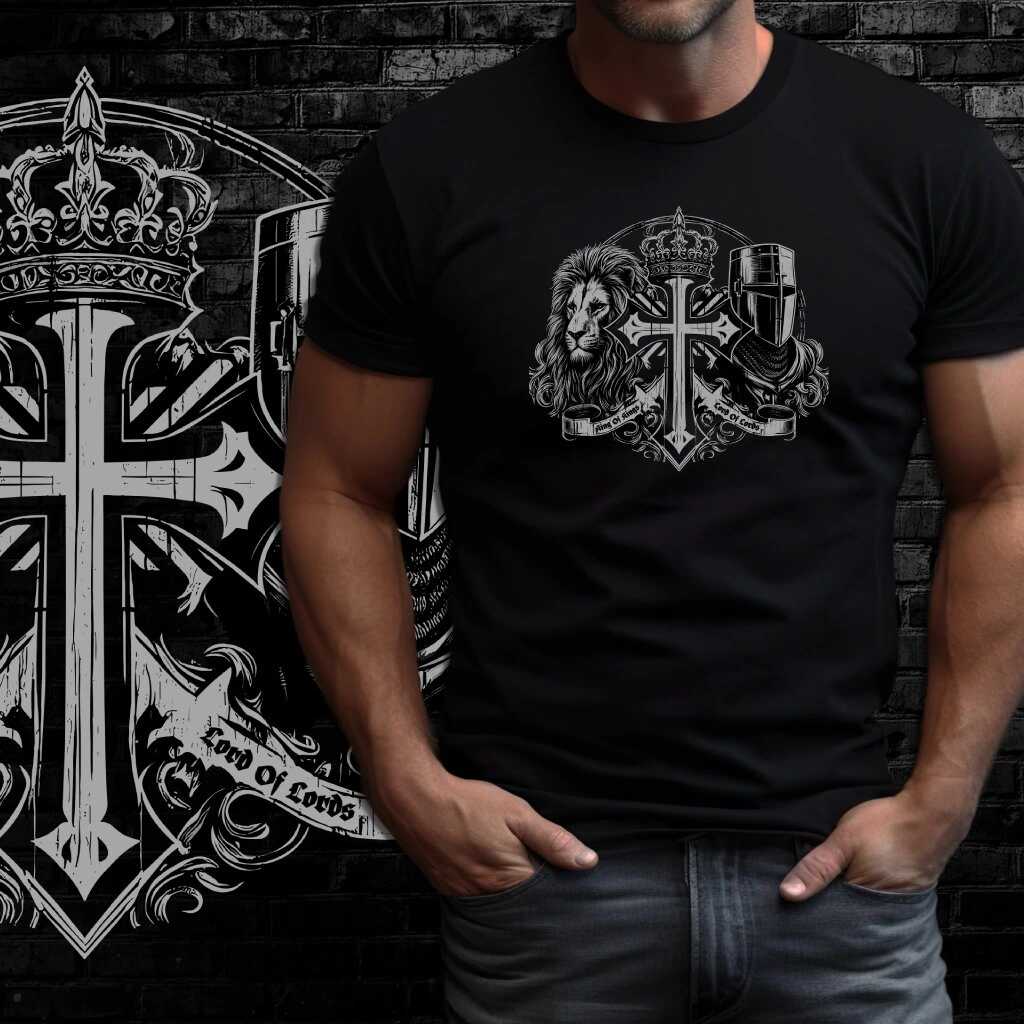 Tričko s křížem a lvem a rytířem. Nápis Lord of Lords, King of Kings. Další podobné motivy najdete v e-shopu Fightandpride.
