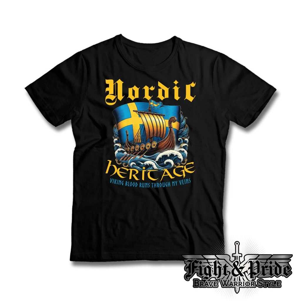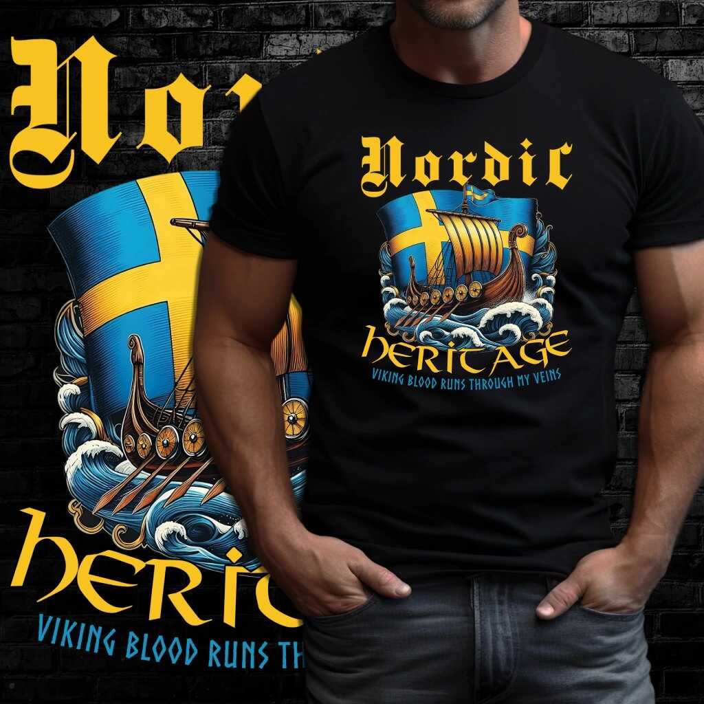 Tričko s potiskem Nordic Heritage-Švédská vlajka a vikingská lod
