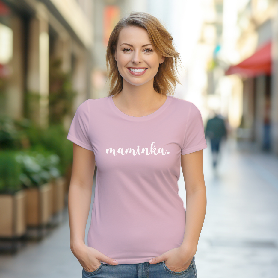 Růžové dámské tričko s bílým potiskem „maminka ♥“.
