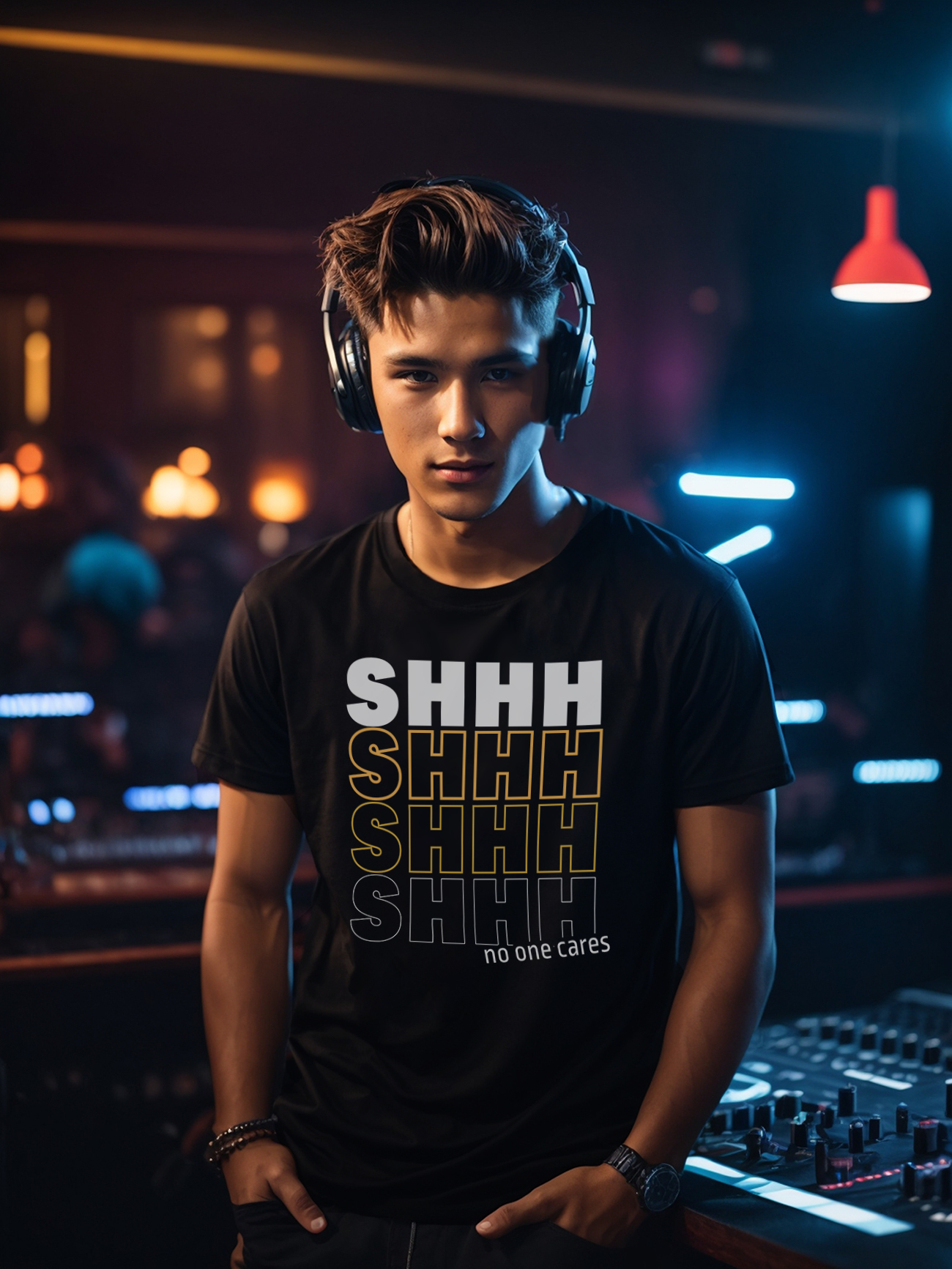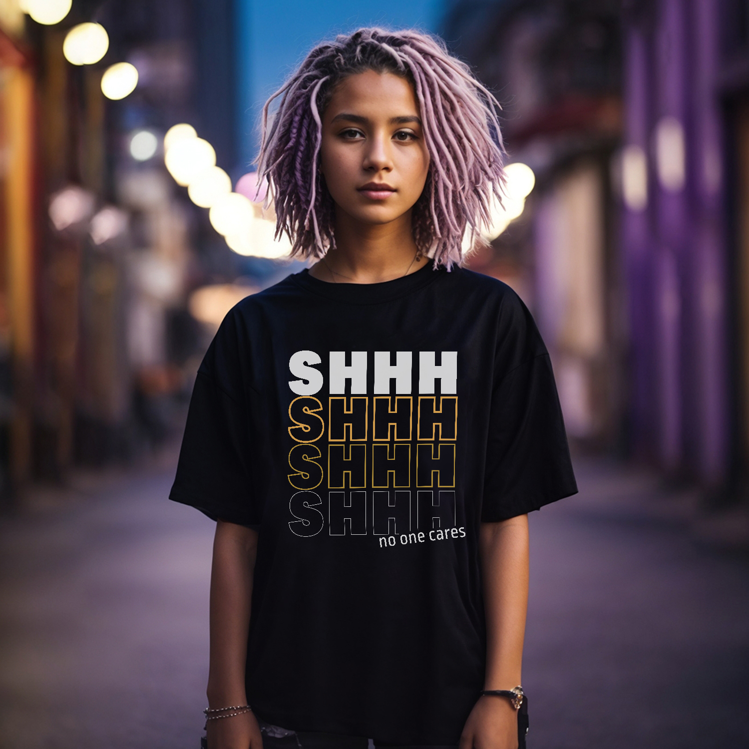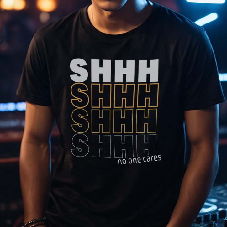 Shhh, no one cares, vtipný textový design. Barvu a typ podkladu lze změnit před vložením do košíku.