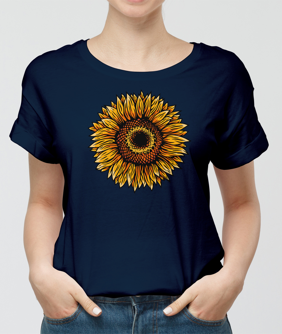 Letné tričko s prírodným motívom, ktorý vyjadruje slnečnica.
